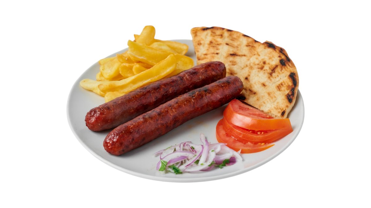 2 Τεμάχια. Συνοδεύεται από πατάτες τηγανητές φρέσκες, ντομάτα, κρεμμύδι, σως ή τζατζίκι και ψητό ζυμαράκι.