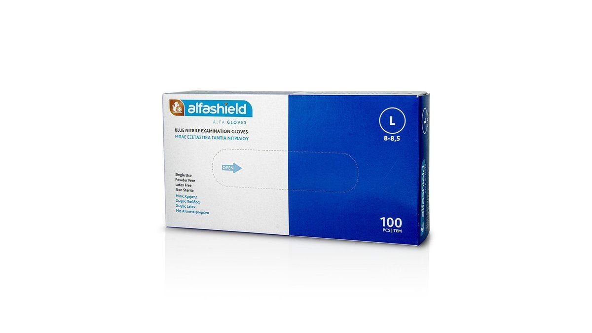 Alfashield Εξεταστικά Γάντια Νιτριλίου Μπλε Χωρίς Πούδρα Large 100 Τεμάχια