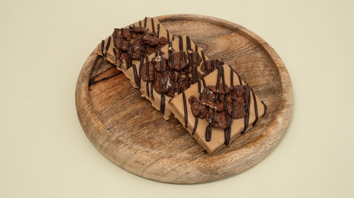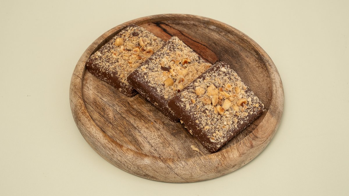 Βρώμη, φυστικοβούτυρο, μέλι, πραλίνα, επικάλυψη σοκολάτας γάλακτος