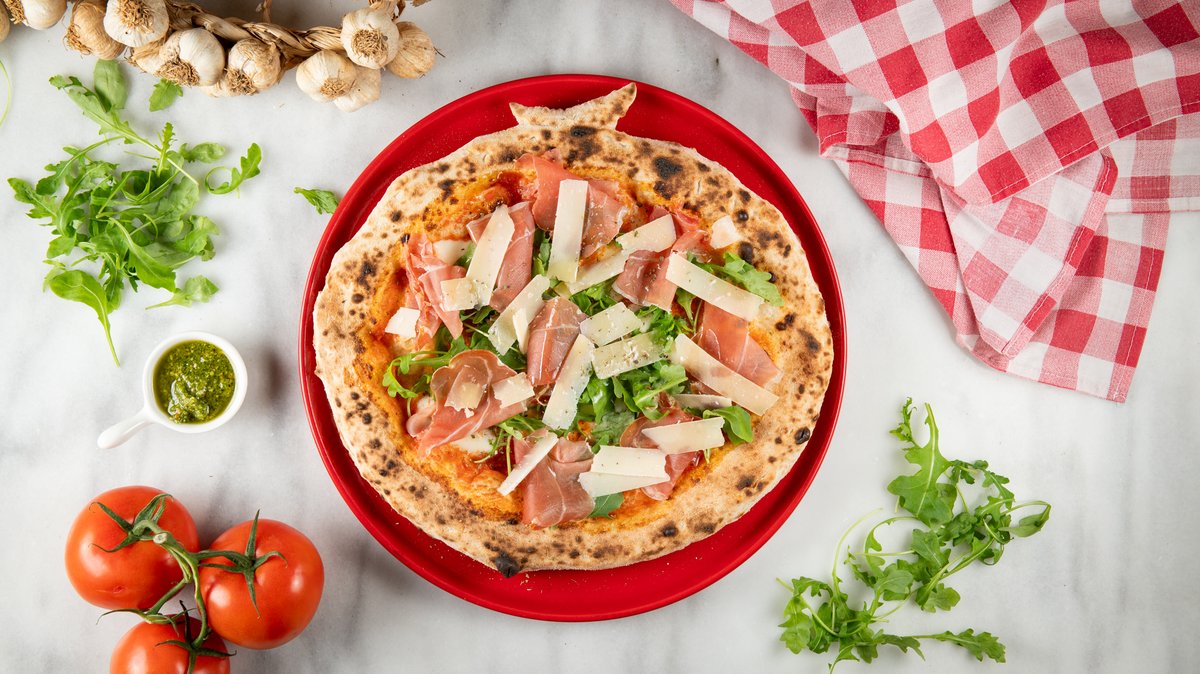 Με ζύμη ωρίμανσης 48 ωρών, αποφλειωμένες ντομάτες San Marzano DOP, μοτσαρέλλα φρέσκια Fior di latte, προσούτο κρούντο di Parma, ρόκα, φλούδες παρμέζανας reggiano και εξαιρετικά παρθένο ελαιόλαδο