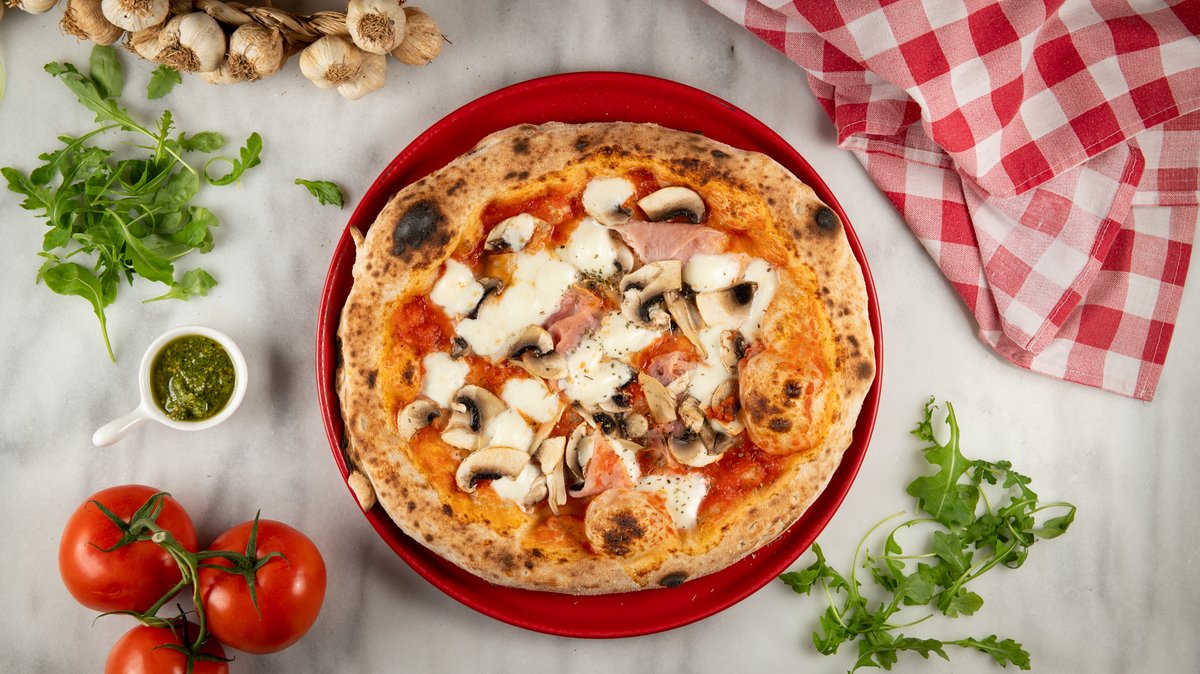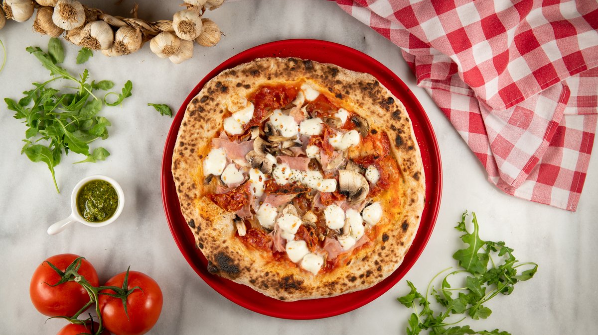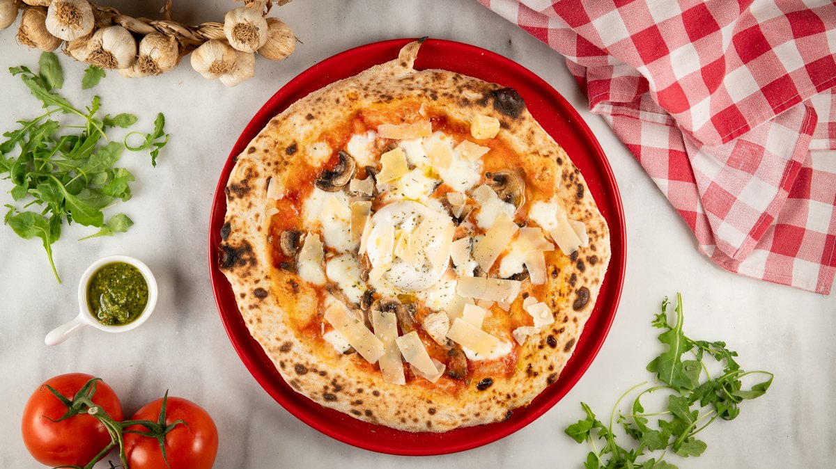 Με ζύμη ωρίμανσης 48 ωρών, αποφλειωμένες ντομάτες San Marzano DOP, μοτσαρέλλα φρέσκια Fior di latte, προσούτο κόττο, μανιτάρια φρέσκα, τριμμένη παρμεζάνα Reggiano και εξαιρετικά παρθένο ελαιόλαδο