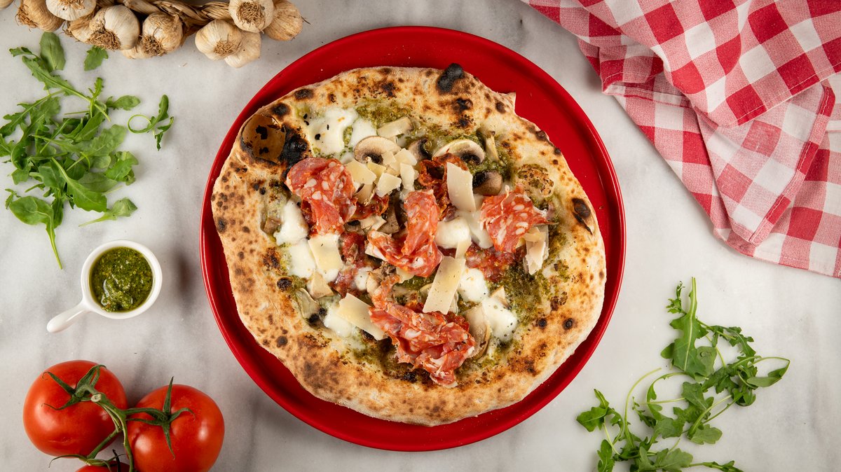 Με ζύμη ωρίμανσης 48 ωρών, αποφλειωμένες ντομάτες San Marzano DOP, προβόλα καπνιστή, μασκαρπόνε, φρέσκα μανιτάρια, σαλάμι di Napoli, λάδι με σκόρδο, ρίγανη και βασιλικό