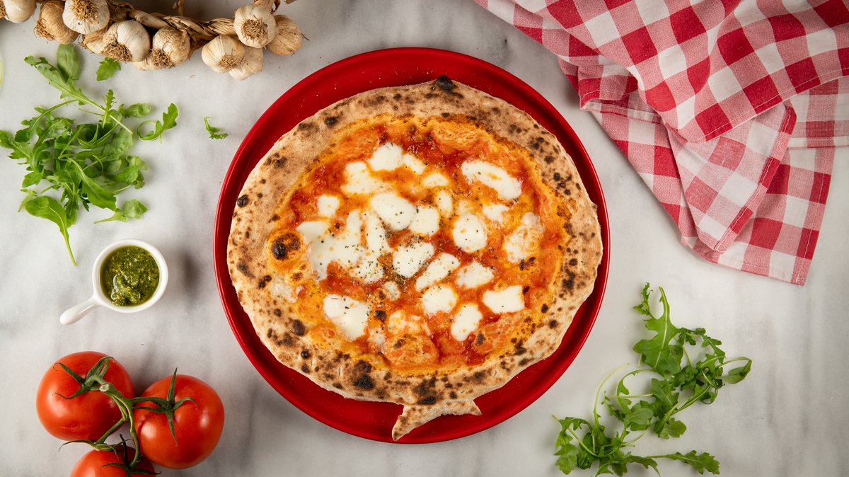 Με ζύμη ωρίμανσης 48 ωρών, αποφλειωμένες ντομάτες San Marzano DOP, μοτσαρέλλα φρέσκια Fior di latte, εξαιρετικά παρθένο ελαιόλαδο και βασιλικό