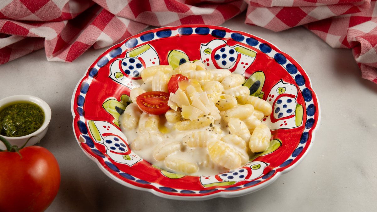 Με ζύμη ωρίμανσης 48 ωρών, φρέσκο πέστο βασιλικού, λάδι αρωματισμένο με σκόρδο, εξαιρετικά παρθένο ελαιόλαδο, straciatella di bufala, ντοματίνια, βασιλικός και ρίγανη