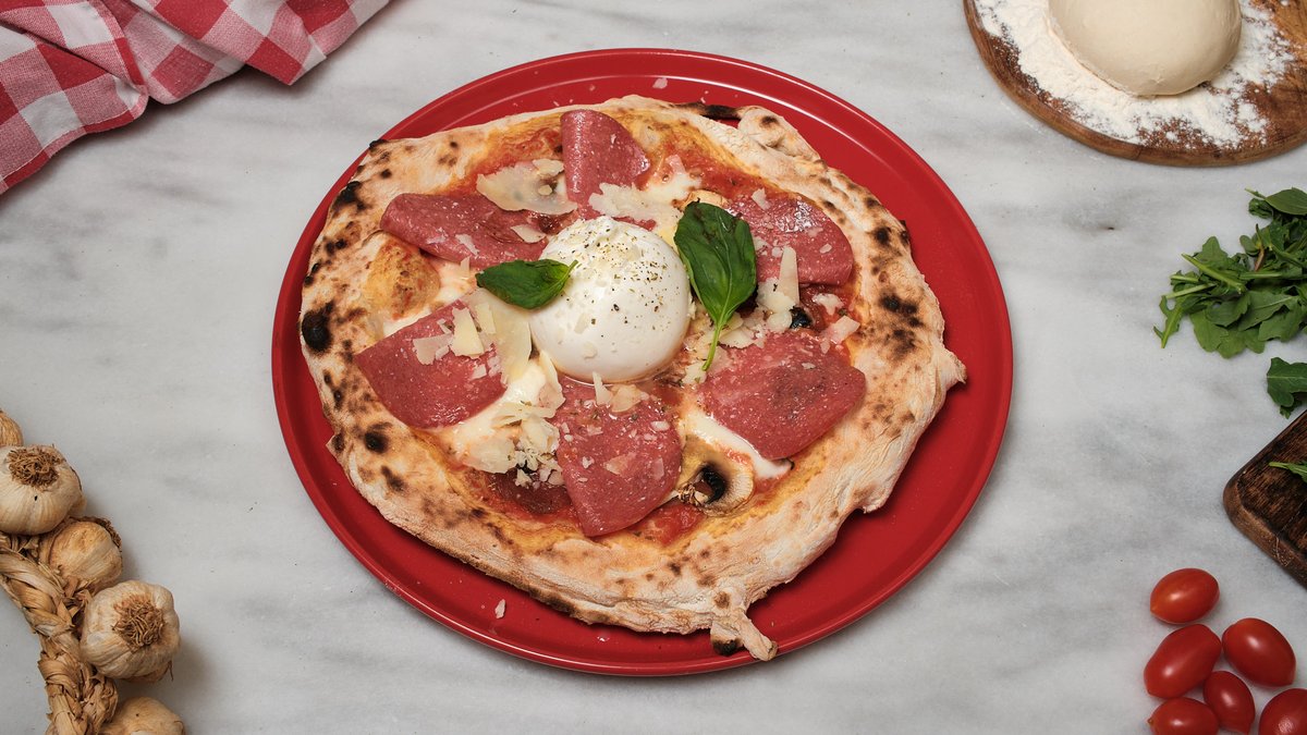 Ζύμη ωρίμανσης 48 ωρών, αποφλοιωμένες ντομάτες San Marzano DOP, φρέσκια μοτσαρέλα Fior di latte, κρέμα nduja, ventricina, straciatella