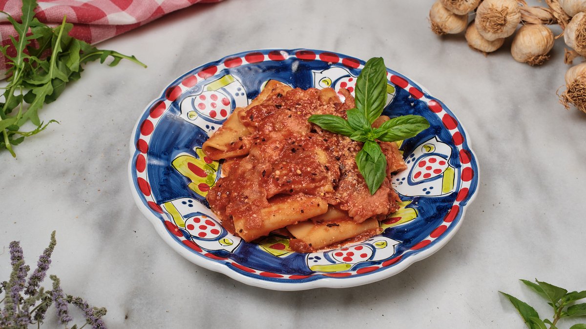 Σιγομαγειρεμένος χοιρινός και μοσχαρίσιος κιμάς, φρέσκο λουκάνικο Tοσκάνης, σάλτσα ντομάτας San Marzano, λαχανικά και μυρωδικά