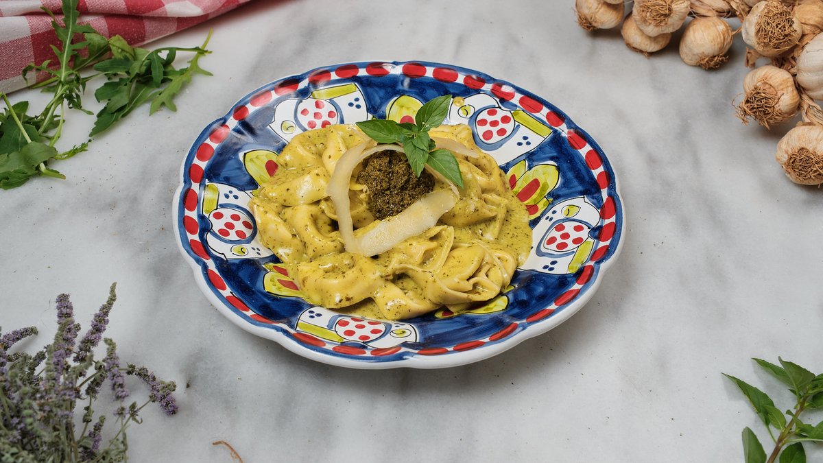 Με ζύμη ωρίμανσης 48 ωρών, πέστο βασιλικού, μοτσαρέλλα φρέσκια Fior di latte, μορταδέλλα φυστίκι di Bologna DOP, φλούδες παρμεζάνας Reggiano