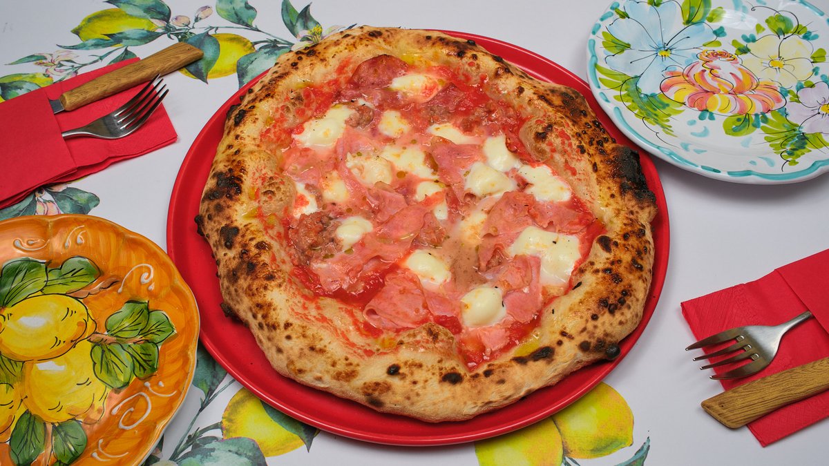 Με αποφλοιωμένες ντομάτες DOP, μοτσαρέλλα φρέσκια Fior di latte, καραμελωμένα κρεμμύδια, μανιτάρια φρέσκα, προσούτο κόττο di toscana, σαλάμι πικάντικο ventricina και κρέμα nduja