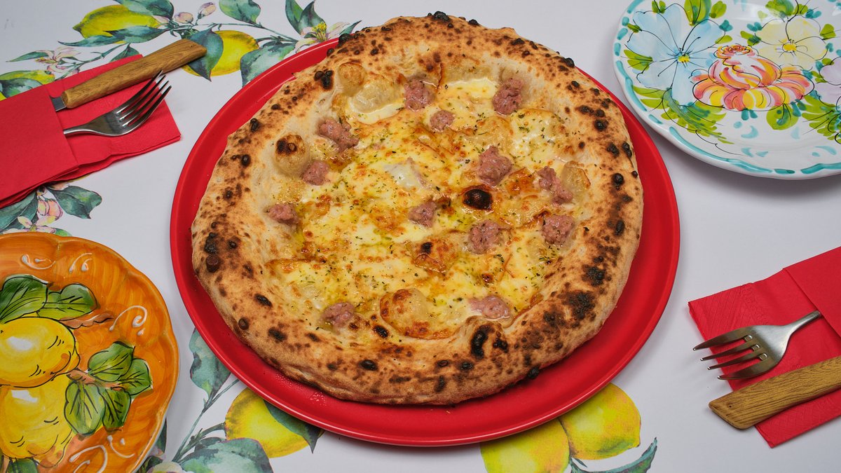 Ζύμη ωρίμανσης 48 ωρών, αποφλειωμένες ντομάτες San Marzano DOP, μοτσαρέλλα φρέσκια Fior di latte, guanciale, σαλάμι di Napoli , λουκάνικο φρέσκο di toscana(salsiccia)