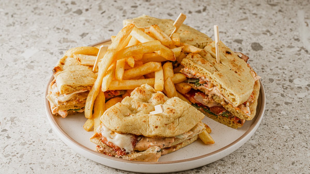 Fried chicken, μαρούλι, ντομάτα, μπέικον, parmesan sauce, σε φρυγανισμένο ναπολιτάνικο ψωμάκι