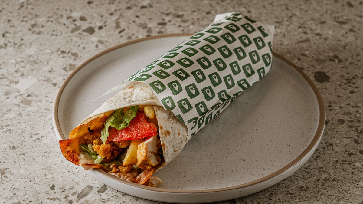 Τορτίγια με ελιές, μαρούλι, κρεμμύδι, πράσινη πιπεριά, φέτα vegan, ντοματίνια και basil vegan mayo