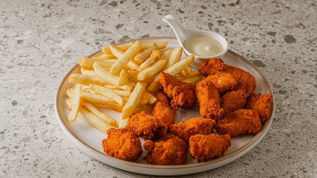 Κοτομπουκιές, πατάτες και σως μουστάρδας