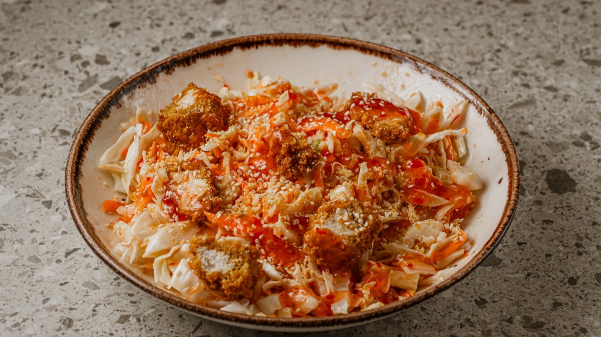 Μπριζολάκι, chili sauce, kimchi salad, cheddar σε φρυγανισμένο ναπολιτάνικο ψωμάκι