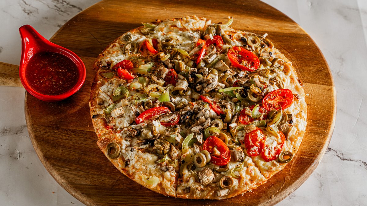 Με σάλτσα ντομάτας, κίτρινο τυρί νηστίσιμο, ντομάτα, μανιτάρια φρέσκα, πιπεριά πράσινη και ελιά