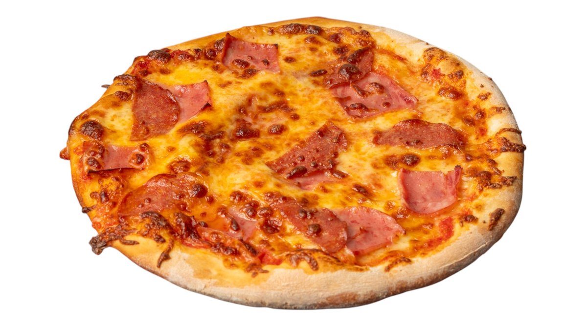 Με σάλτσα ντομάτας, gouda, ζαμπόν, μπέικον, πεπερόνι, σαλάμι μπύρας, πιπεριά πράσινη και μανιτάρια φρέσκα