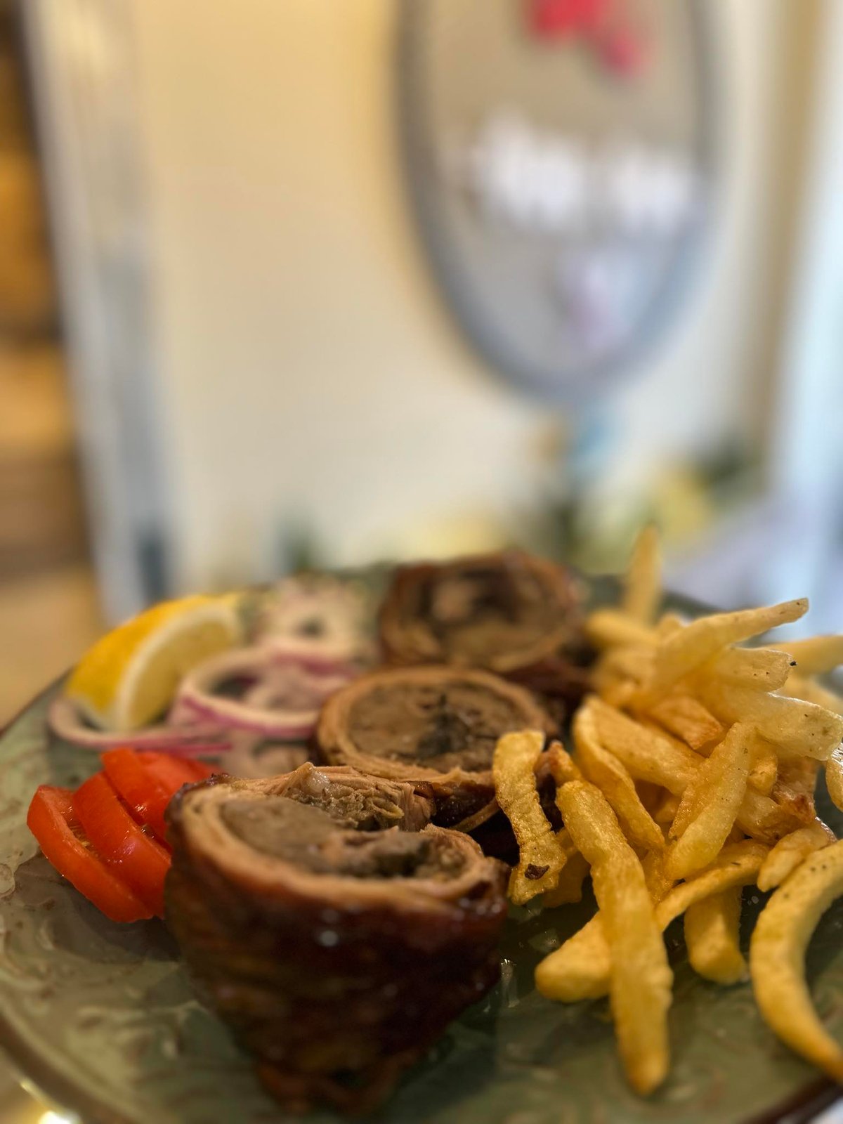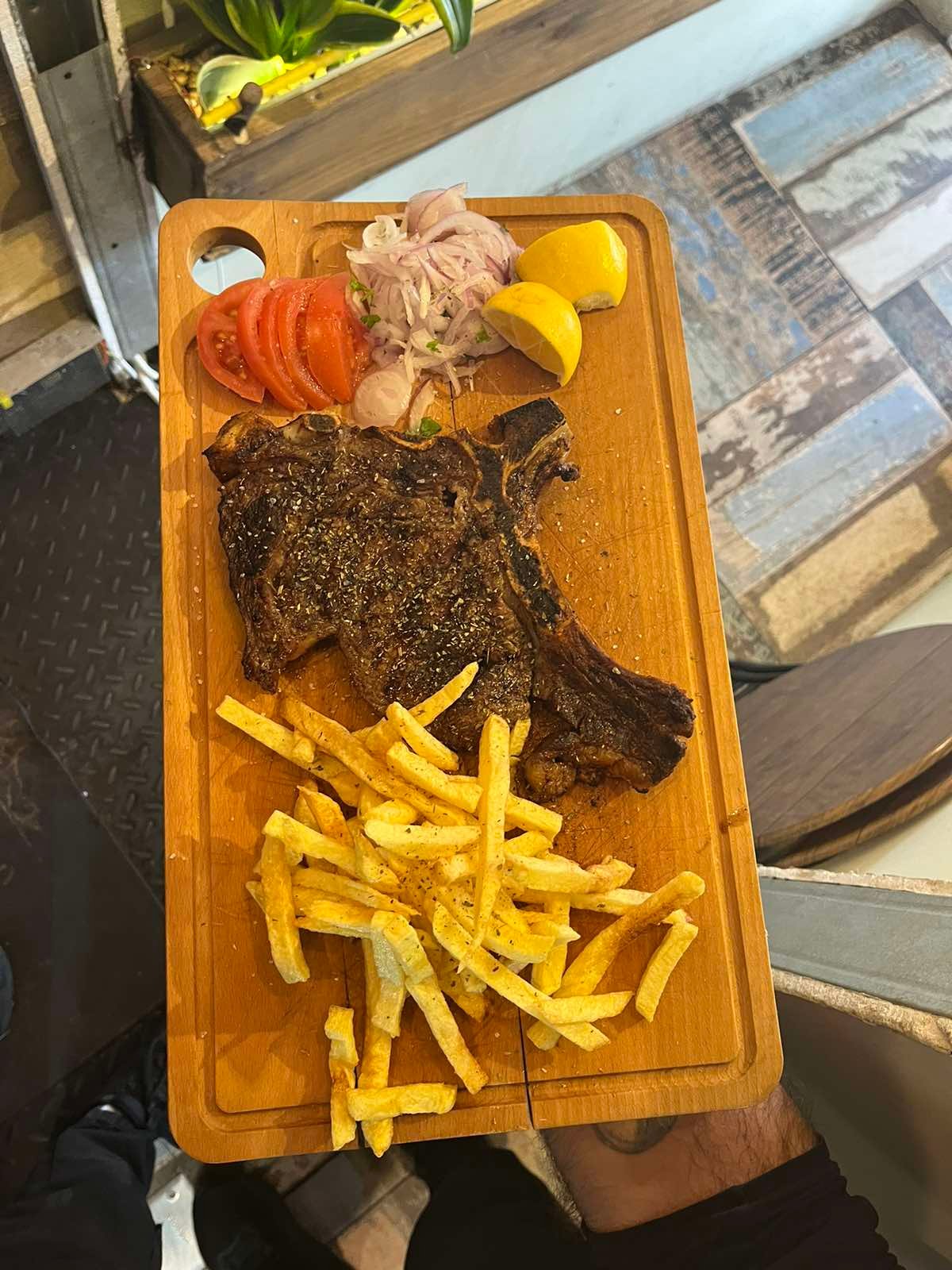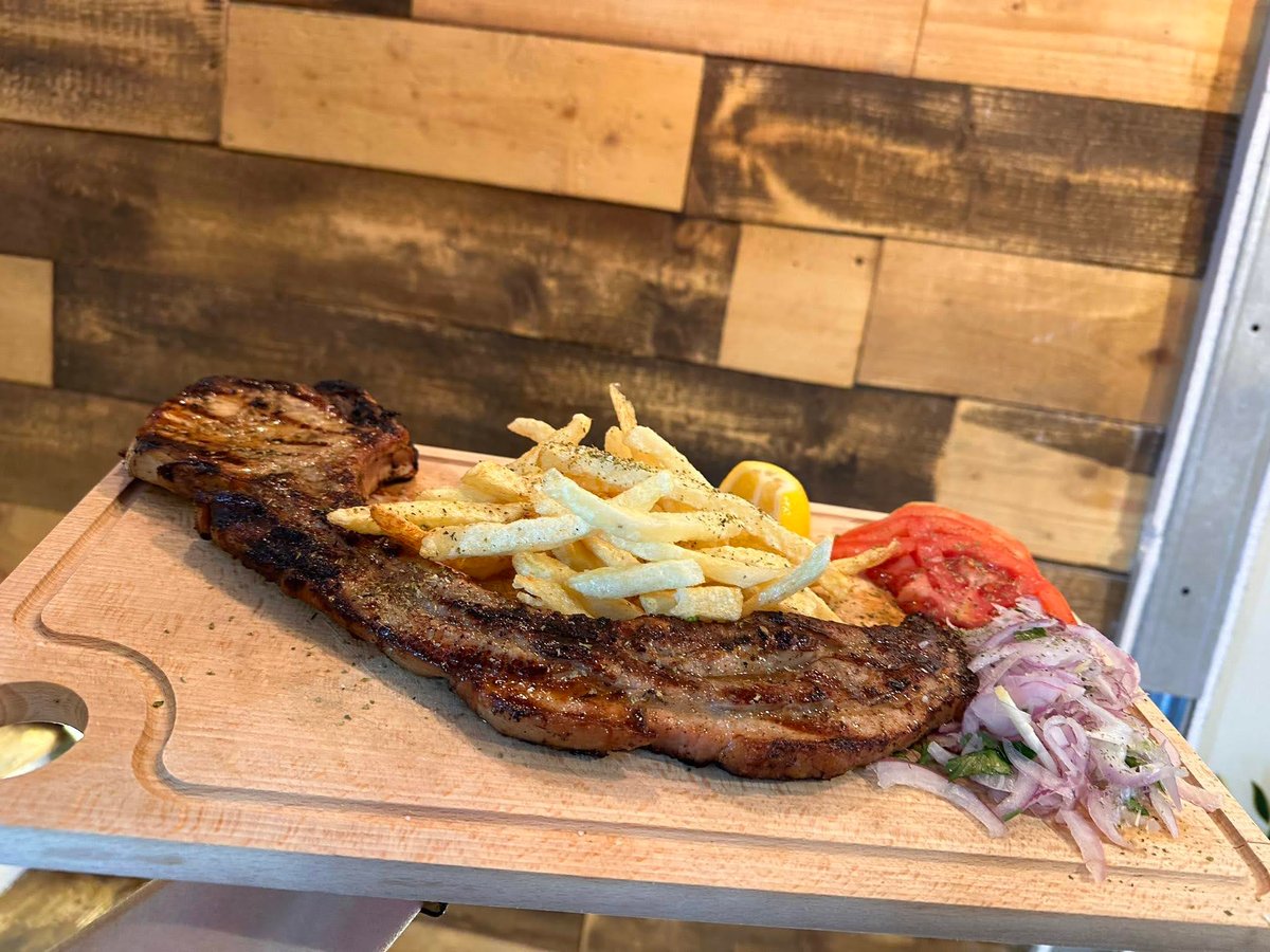 600g. Συνοδεύεται από ντομάτα, κρεμμύδι και πατάτες τηγανητές