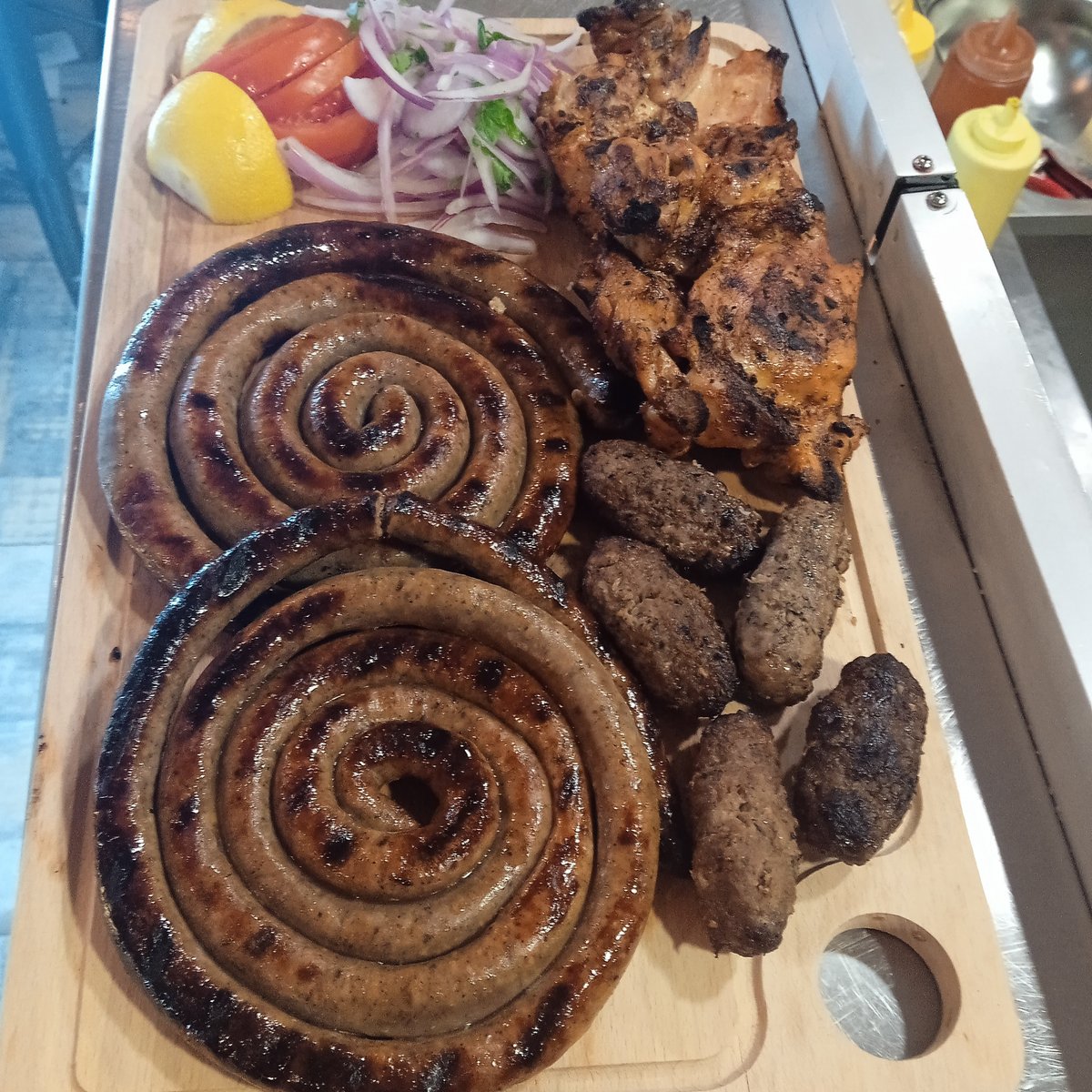 Με 2 σουβλάκια χοιρινά, 2 σουτζουκάκια, 1 λουκάνικο χωριάτικο, 2 πανσέτες χοιρινές, 2 μπριζολάκια χοιρινά. Συνοδεύονται με ντομάτα, κρεμμύδι και πατάτες τηγανητές και 2 λαδόπιτες