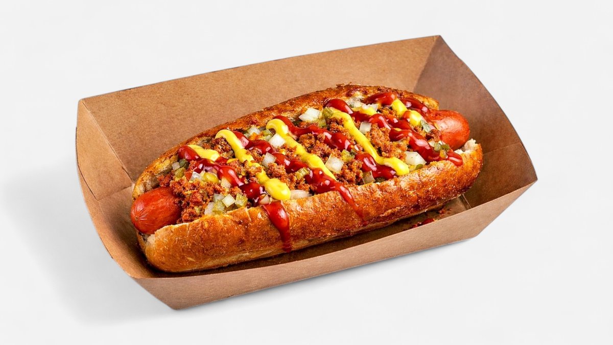 Λουκάνικο πεπερόνι, πικάντικος κιμάς, κρεμμύδι, αγγουράκι τουρσί, μουστάρδα και ketchup