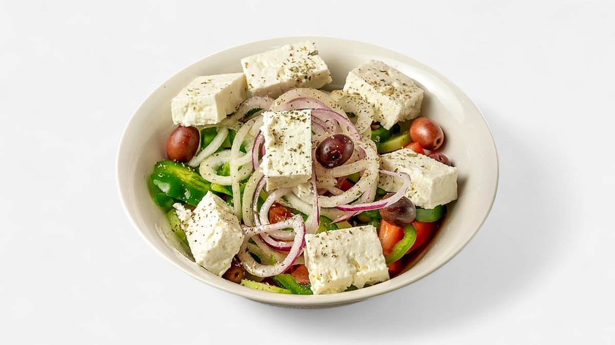 Ντομάτα, αγγούρι, πιπεριά, κρεμμύδι, φέτα, ελιές, κρητικά παξιμάδια, ελαιόλαδο, ρίγανη, ξύδι, κριτσίνια