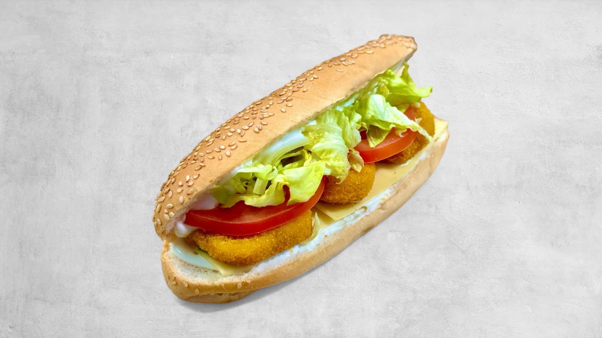 Ψωμάκι σταρένιο, με τραγανές κοτομπουκιές ψημένες στο φούρνο, ντομάτα, gouda, iceberg και μαγιονέζα