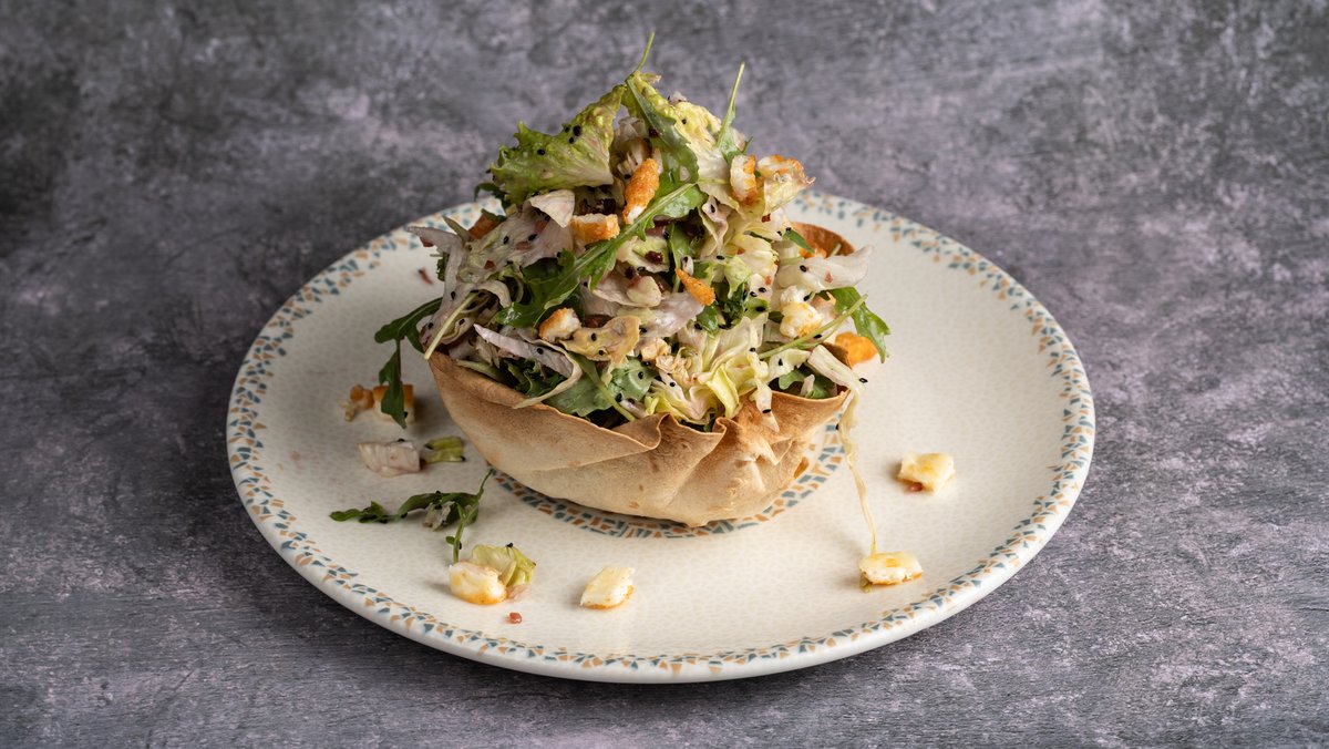 Καραμελωμένη χοιρινή πανσέτα ψιλοκομμένη με σαλάτα κηπουρού και bbq sauce. Συνοδεύεται από πατάτες τηγανητές