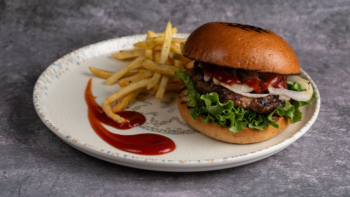 Με μπιφτέκι από 100% μοσχαρίσιο κιμά, ντομάτα, κρεμμύδι, μαρούλι και ketchup. Συνοδεύεται από πατάτες τηγανητές