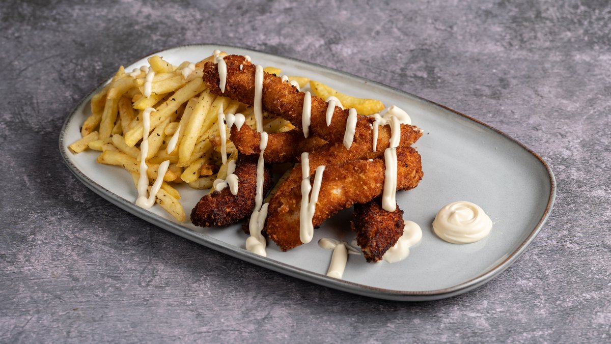 Με σνίτσελ κοτόπουλο, μαρούλι, ντομάτα και σως μουστάρδας. Συνοδεύεται από πατάτες τηγανητές