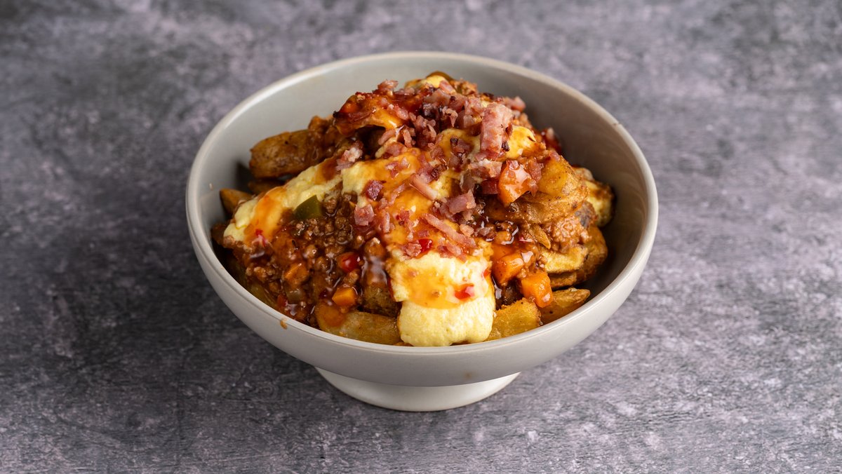 Πατάτες με τσίλι κον καρνέ, τσένταρ και ψιλοκομμένο μπέικον