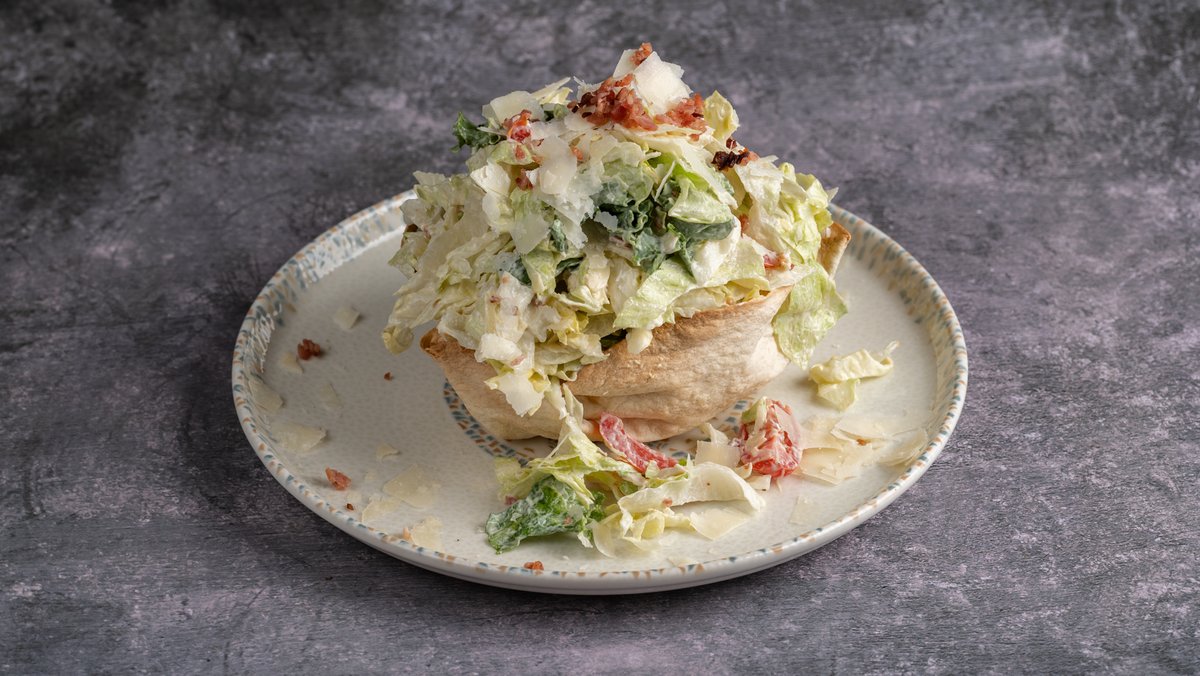 Φρεσκομμένη ανάμεικτη σαλάτα με ψητό φιλέτο κοτόπουλο, ντοματίνια, παρμεζάνα, τραγανό μπέικον και Caesar`s sauce