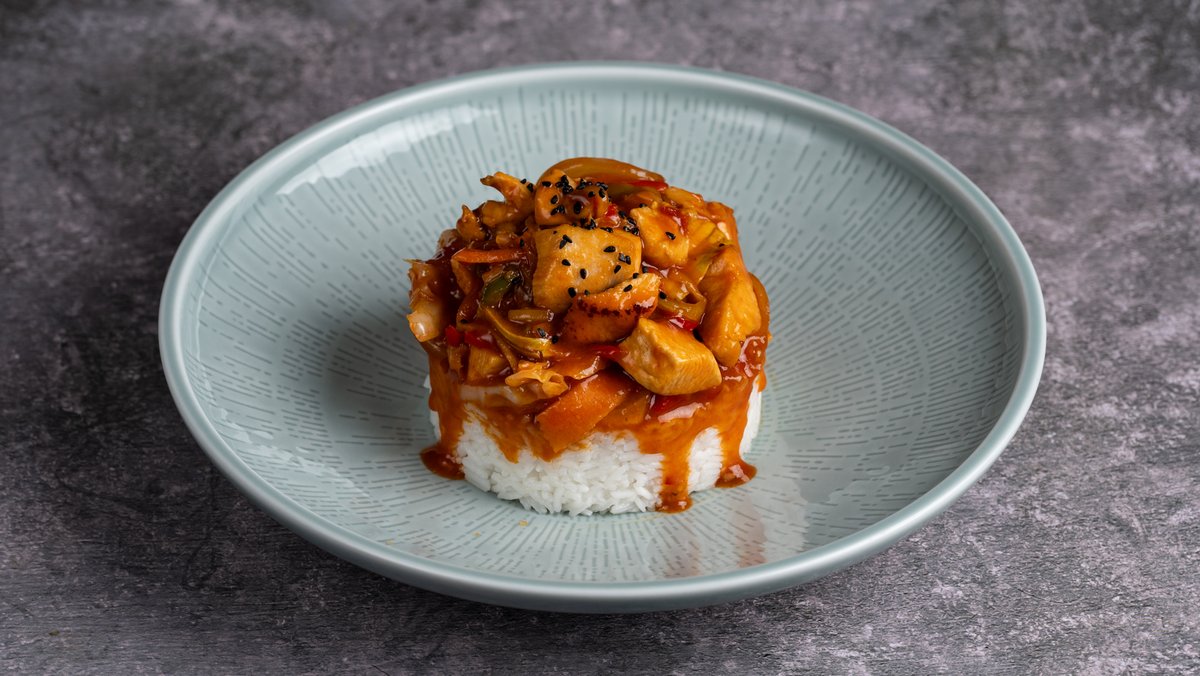 Μαγειρεμένο με chili σάλτα και ανάμεικτα λαχανικά, σερβιρισμένο με ρύζι μπασμάτι
