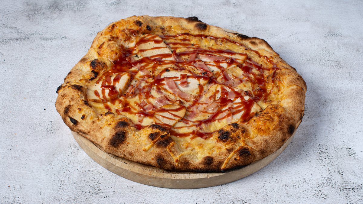 Χειροποίητο ζυμάρι ωρίμανσης, σάλτσα ντομάτας mozzarella, κοτόπουλο και σάλτσα μπάρμπεκιου