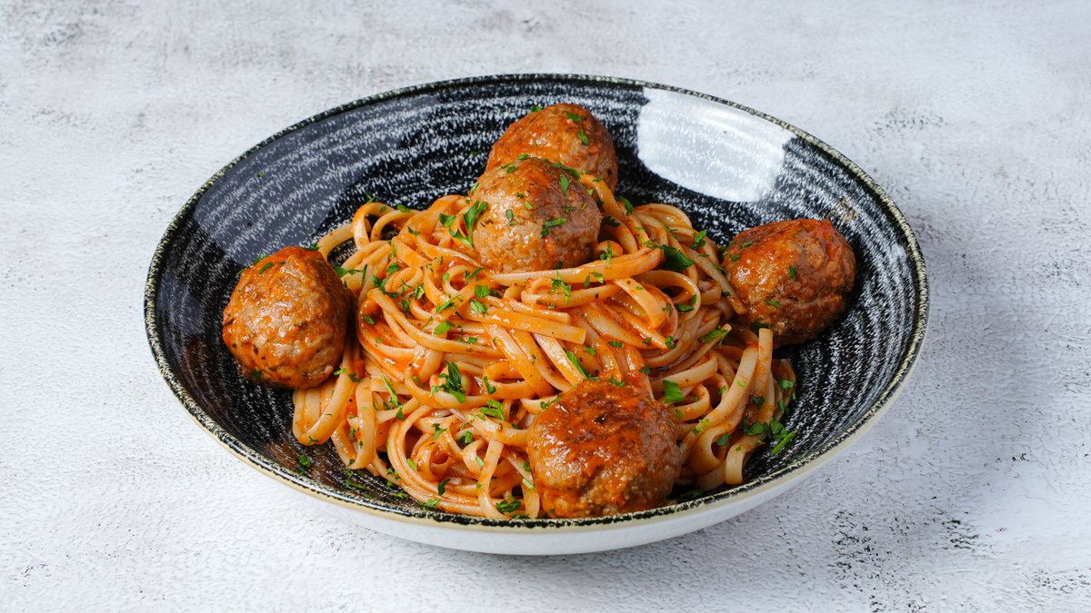 Mε 100% μοσχαρίσια κεφτεδάκια, σκόρδο, βασιλικό, κρεμμύδι, παρμεζάνα, ντομάτες, νιφάδες τσίλι και φρέσκος βασιλικός 575 cal. Με 52 g πρωτεΐνης, 68 g υδατάνθρακες και 10 g λιπαρά