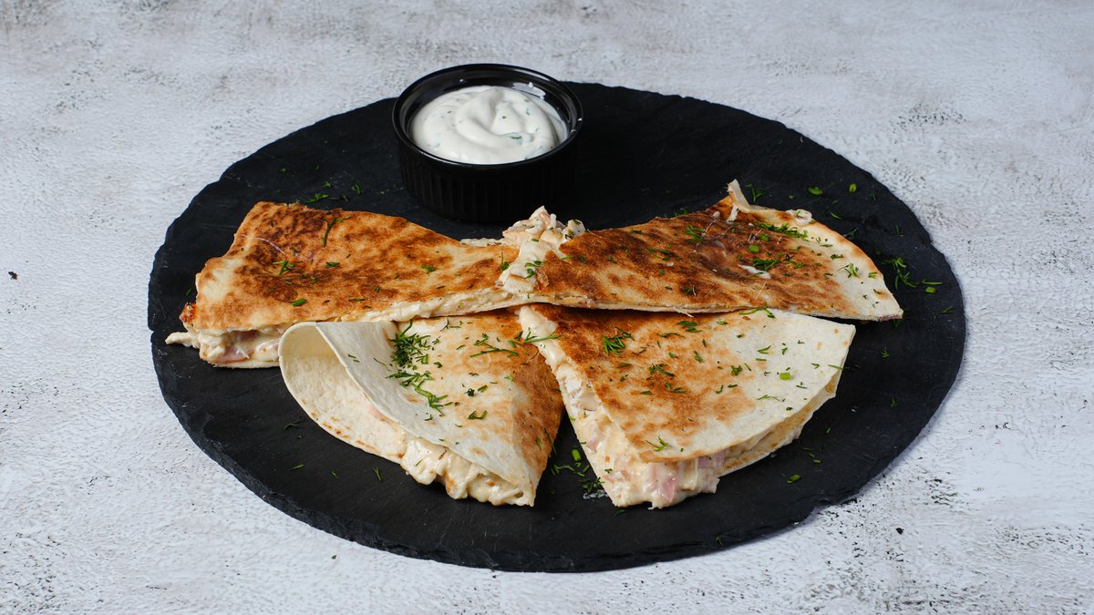 Χειροποίητο ζυμάρι ωρίμανσης, σάλτσα ντομάτας, mozzarella, κοτόπουλο, πιπεριές, μανιτάρια και κρέμα τυριού Philadelphia