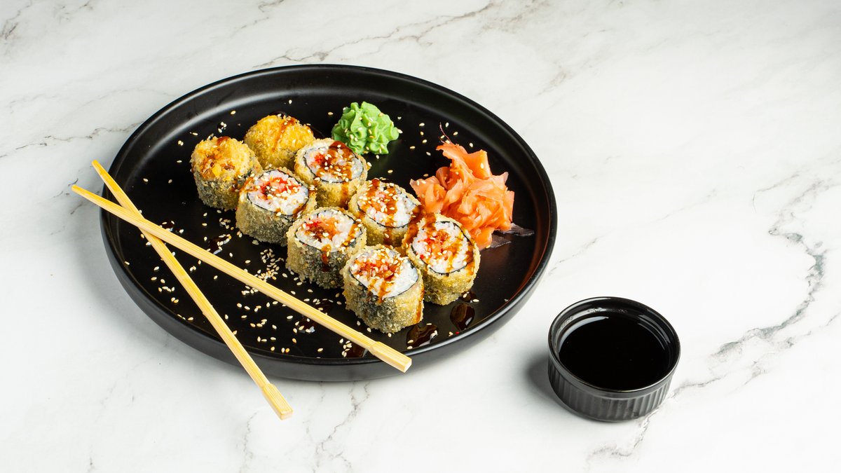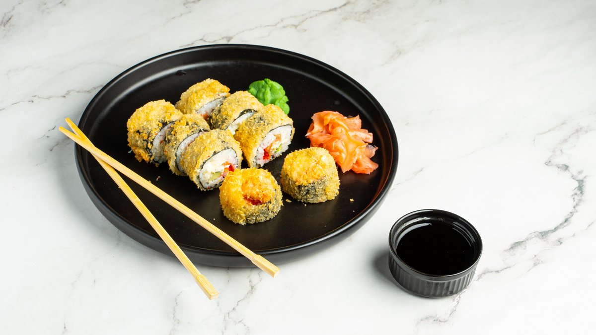 Καπνιστός σολομός, τυρί κρέμα, αγγούρι, tobiko και τραγανή επικάλυψη panko.