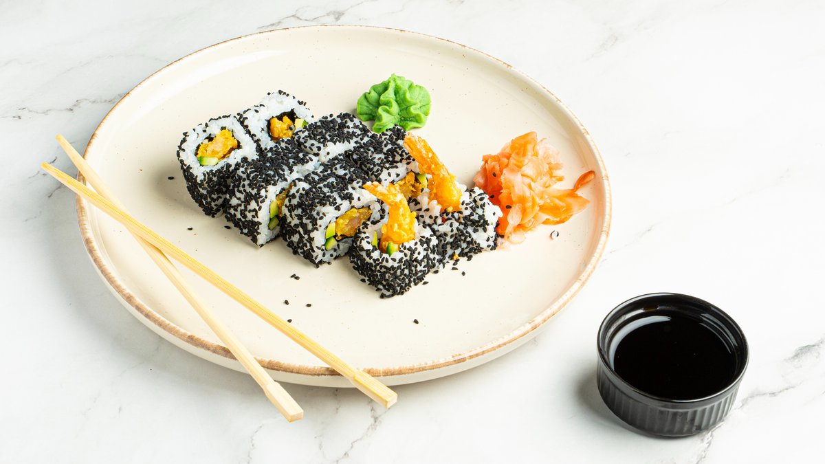 Γαρίδα tempura, αβοκάντο, αγγούρι, chili sauce και επικάλυψη μαύρο σουσάμι.