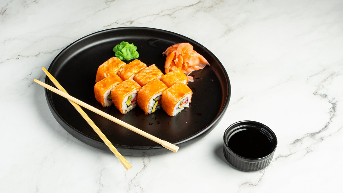 Καπνιστός σολομός, αβοκάντο, στικ καβουριού, αγγούρι και γλυκιά σως καραμέλας.