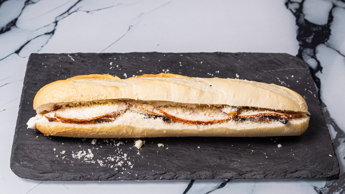 Κοτόπουλο ψητό σε λωρίδες, iceberg, σως Caesar, μπέικον, παρμεζάνα και sweet mayo.