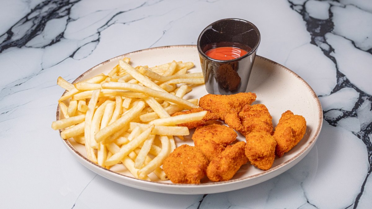 Φιλέτο κοτόπουλο σε μπουκιές παναρισμένο, με τραγανή υφή και ζουμερό εσωτερικό. Συνοδεύεται από πατάτες τηγανητές
