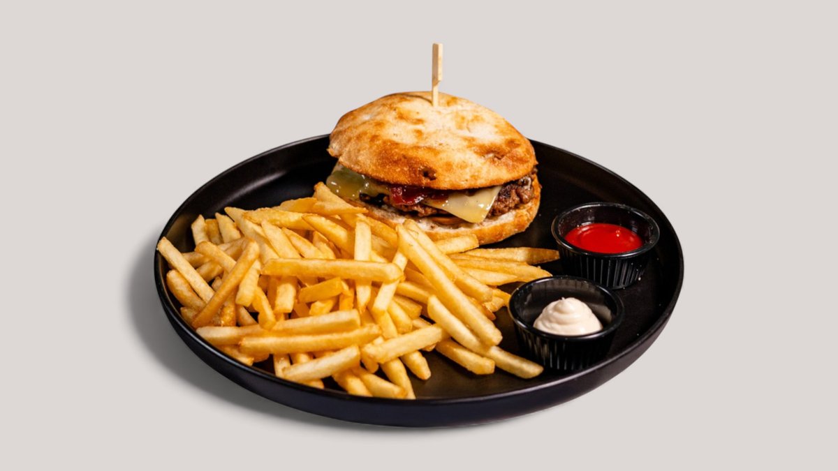 Μοσχαρίσιο μπιφτέκι 200g με τσένταρ, μπέικον, μαγιονέζα, BBQ, καραμελωμένα κρεμμύδια και αγγουράκι τουρσί σε ψωμάκι μπριός. Προαιρετικά σερβίρεται με τηγανητές πατάτες.