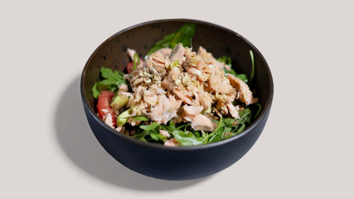 Σολομός φιλέτο, φακές βρασμένες, μίξ baby leaves, ντοματίνια, αβοκάντο, ελαιόλαδο, μουστάρδα Dijon, μέλι, αλάτι, πιπέρι, χυμός λεμονιού.