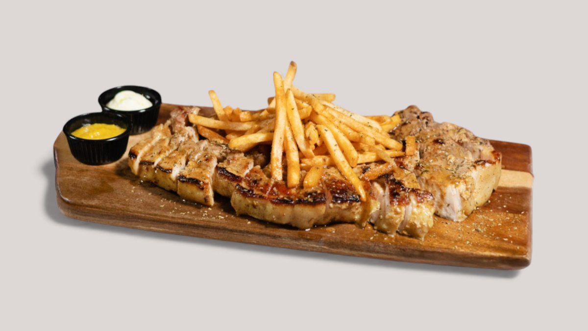 Χειροποίητο ψωμί, ψαρονέφρι, BBQ South Carolina σως, σοταρισμένα μανιτάρια, γκούντα & παρμεζάνα, κρεμώδες τυρί τύπου spread, πατάτες τηγανητές.