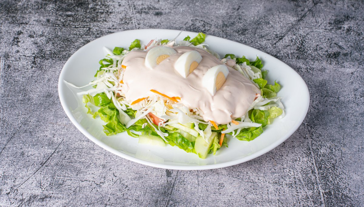 Σαλάτα με μαρούλι, ντομάτα, αγγούρι, λάχανο, καρότο, ζαμπόν, gouda, αυγό βραστό και chef sauce
