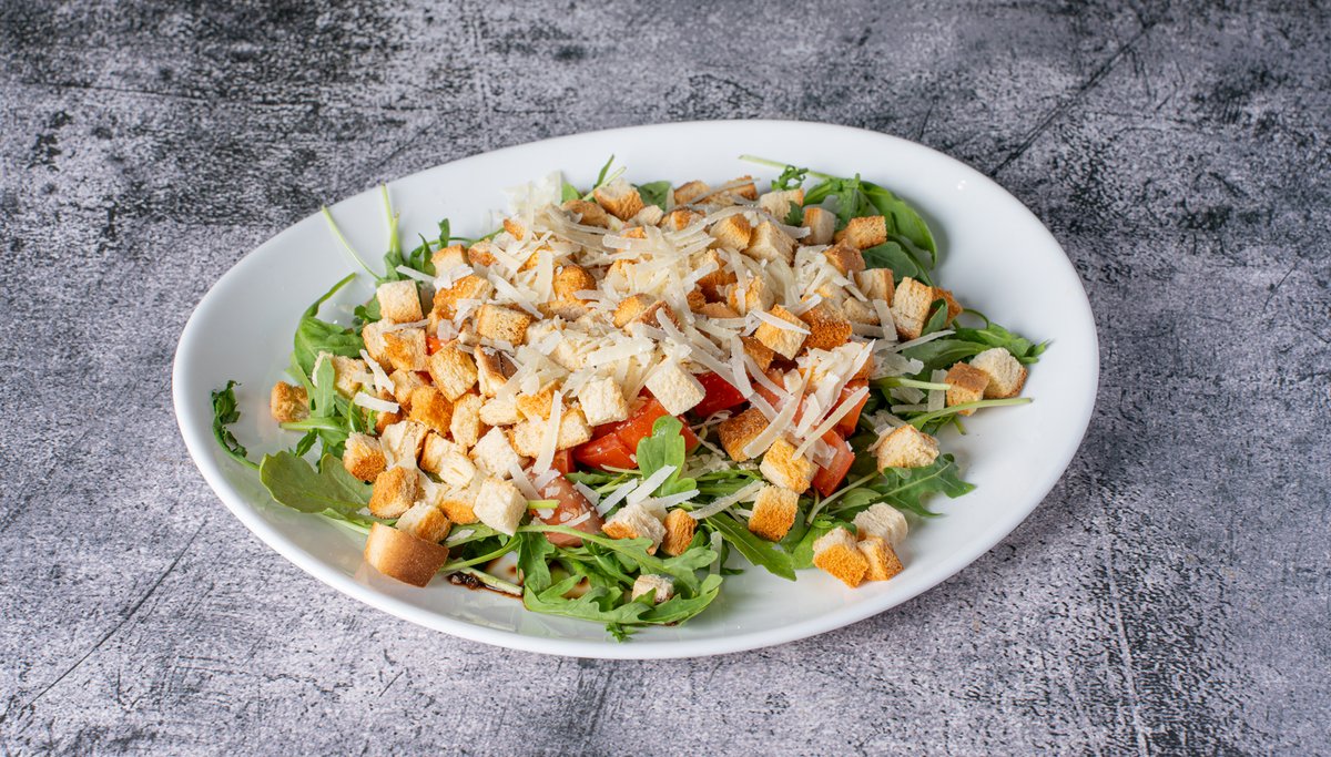 Σαλάτα με ρόκα, παρμεζάνα, ντομάτα, κρουτόν και βαλσάμικο