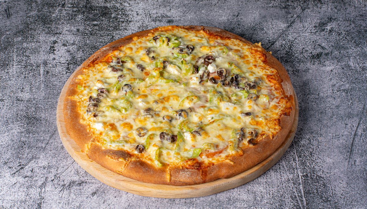 Με λευκό τυρί (Έδεσμα), ντομάτα, πιπεριά, κρεμμύδι, ελιές, σάλτσα ντομάτας και τυρί