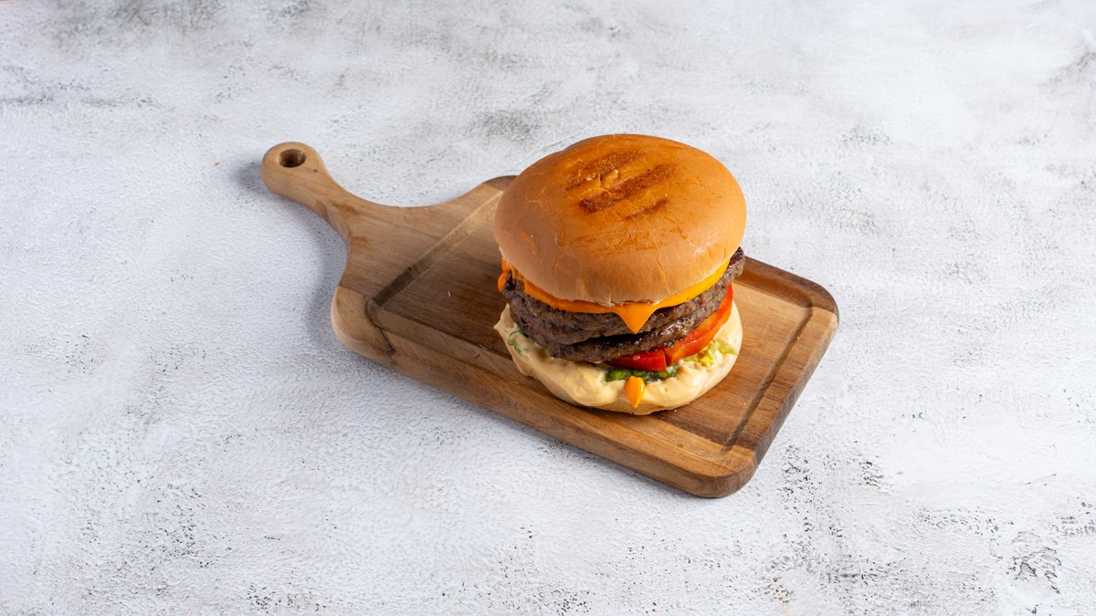 Με τριπλό smash μπιφτέκι 100% μοσχαρίσιο, μαγιονέζα premium, spicy sriracha, BBQ sauce, τριμμένη παρμεζάνα και φρέσκο κρεμμύδι