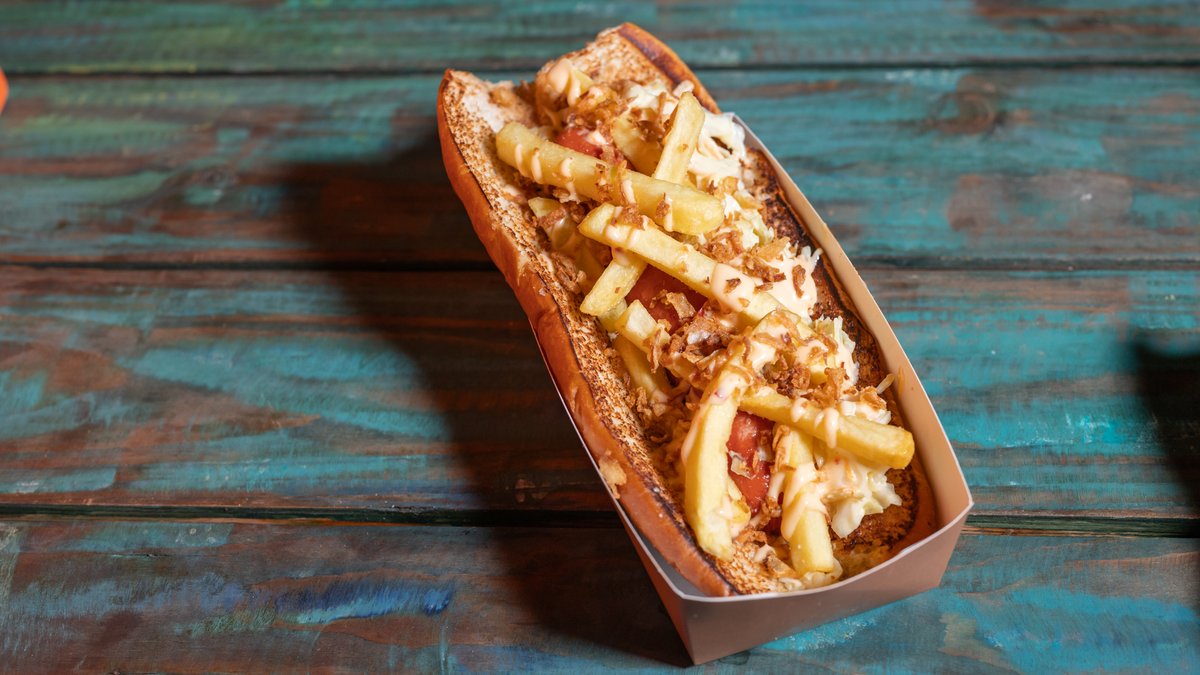 λουκάνικο, τυρί, ντομάτα, πατάτες τηγανιτές, κέτσαπ, μουστάρδα και mayo