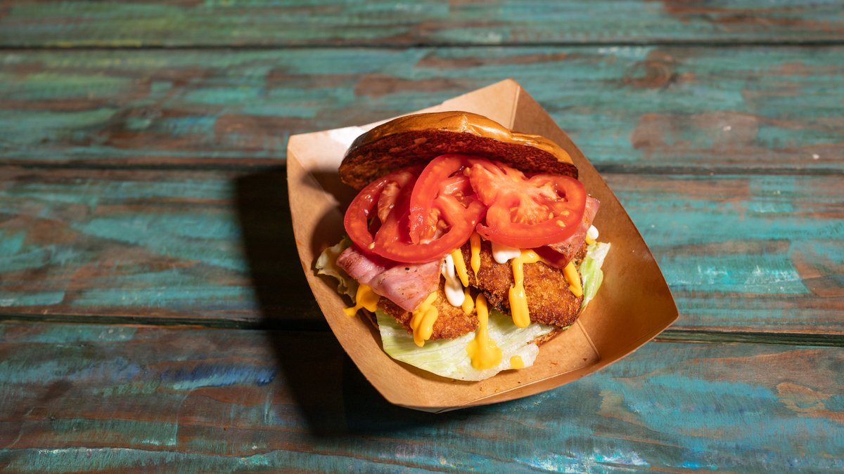 Φιλέτο κοτόπουλο πανέ, cheddar, μπέικον, ντομάτα, iceberg, mayo και Brooklyn's Sauce