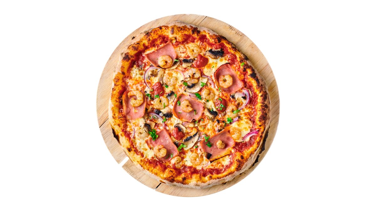 Με σάλτσα ντομάτας, mix τυριών (edam, gouda και παρμεζάνα), ζαμπόν, μπέικον, πεπερόνι, φρέσκια ντομάτα, πιπεριά και μανιτάρια