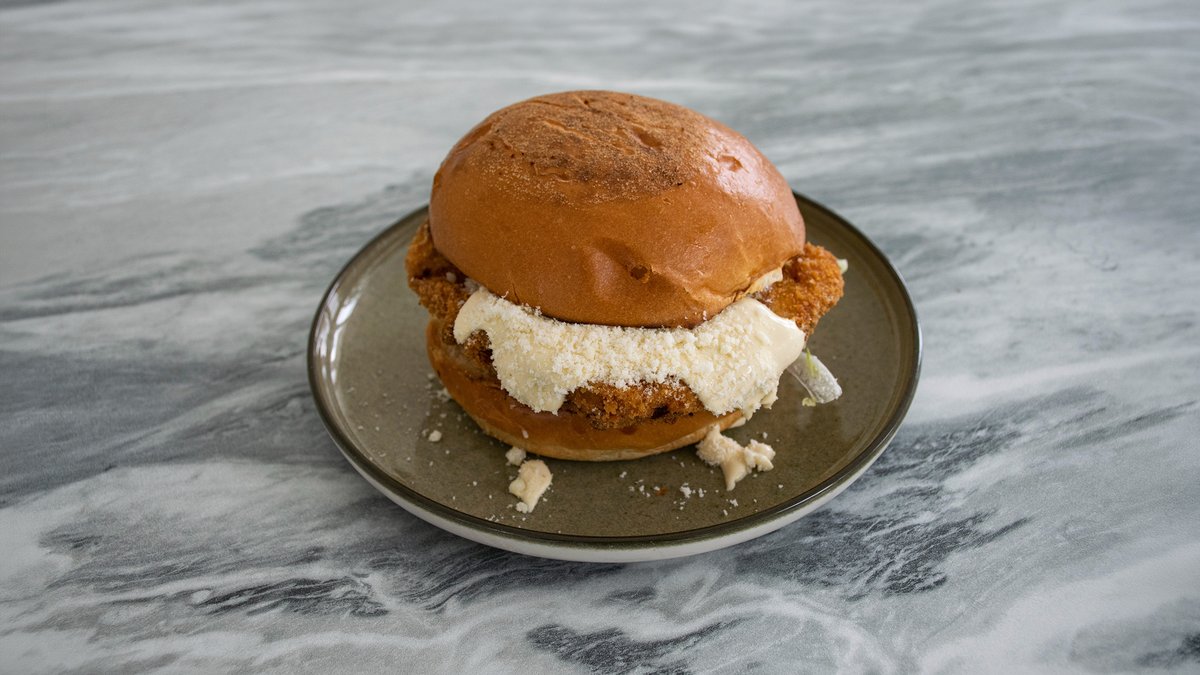 Ψωμί μπριός, φιλέτο κοτόπουλο πανέ, μπέικον, παρμεζάνα, iceberg, caesars mayo