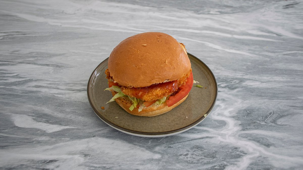 Ψωμί μπριός, φιλέτο κοτόπουλο πανέ, ντομάτα, τσιπς κρεμμυδιού, iceberg, sweet chilli sauce